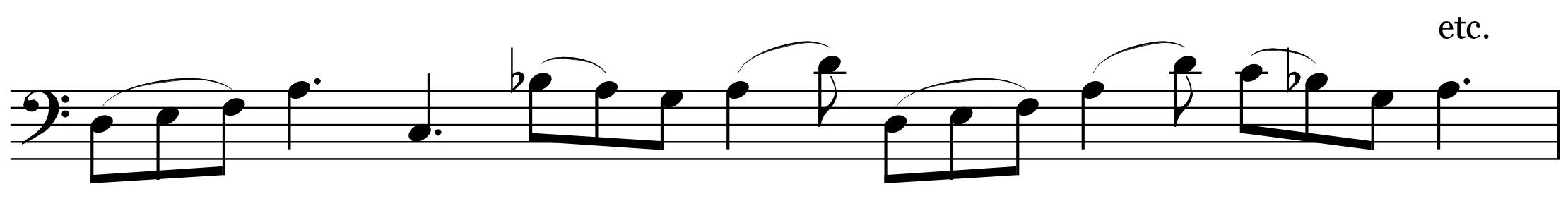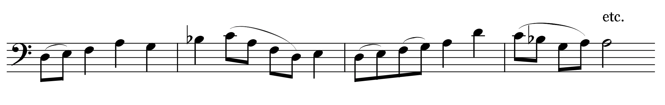4) Next, try improvising a melody in groups of two using only notes from the scale or pitch collection you've picked. This example of a possible improvisation uses only groups of 2, and is in D minor (natural minor). The rhythms are combinations of eighth, quarter, and half notes, but other duple rhythms would be possible as well:
