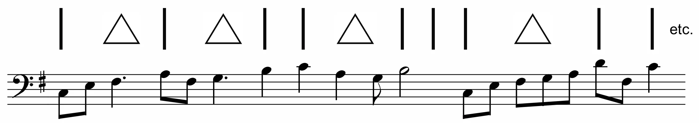 As before, play your pattern on a single note and once that feels easy you can start to improvise. Of course, you can also just improvise freely between 2's and 3's without a plan, but if you want to see one example of a really complicated pattern here's an example that uses the combination 2 + 3, 2 + 3, 2 + 2 + 3, 2 + 2 + 2 + 3, 2 + 2 etc. (!!!), as well as showing the dashes and triangles in the music: